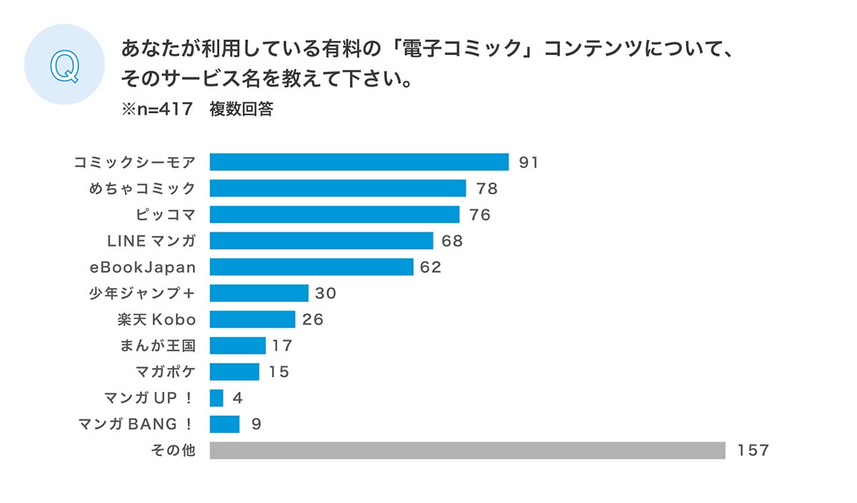 近年、拡大傾向が続いている電子コミック市場では、本アンケートで利用者数がトップの「コミックシーモア」(約22%)、2位の「めちゃコミック」(約19%)をはじめ、有力なサービスが連立しています。その他にも、新サービスの登場、合従連衡、海外展開などの動きもみられ、電子コミック市場は活況を呈しています。