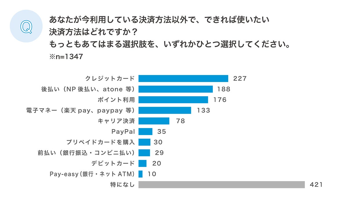 利用者ニーズの高い決済方法としては「クレジットカード」(約17%)、「後払い」(約14%)、「ポイント利用」(約13%)、「電子マネー」(約10%)が上位にあがっています。