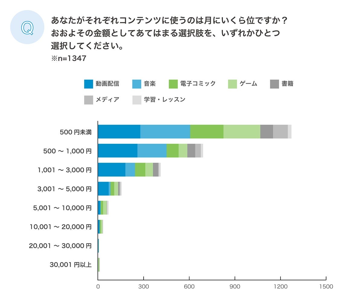 利用されているコンテンツは「動画配信」「音楽」「電子コミック」「ゲーム」が4大コンテンツで、購入方法もダウンロード、サブスクリプションやライブ配信チケットなどを、楽しみ方に合わせて選んでいるようです。また、デジタルコンテンツに使う月額は「1,000円以下」の方が多く、負担にならない範囲で継続的に利用されている傾向が読み取れます。