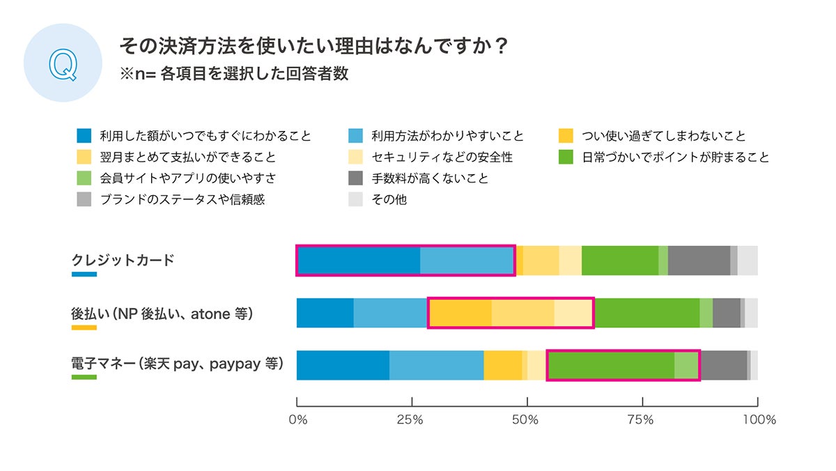 さらに、「クレジットカード」「後払い」「電子マネー」(ポイント利用は特殊な決済のため除く)を”使いたい理由”については下記の通りです。