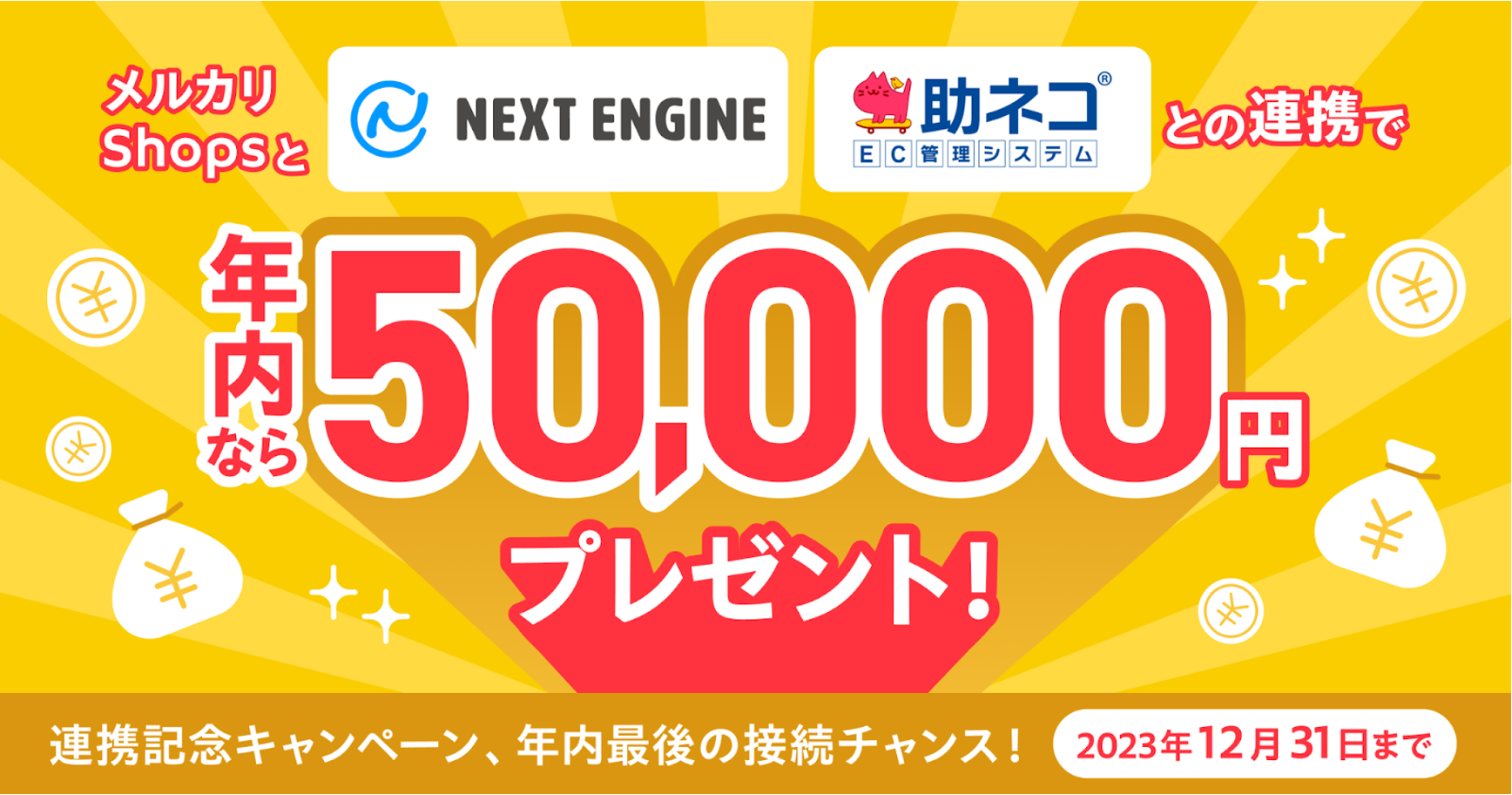 キャンペーン期間中に「メルカリShops」とネクストエンジンまたは助ネコとのAPI連携を初めて行った方に向け、5万円をプレゼントいたします。