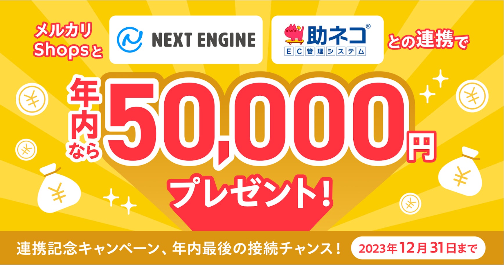 「メルカリShops」では、事業者の皆さまを対象に2023年12月4日(月)から2023年12月31日(日)の期間中、「ネクストエンジン・助ネコ連携記念キャンペーン」を実施いたします。