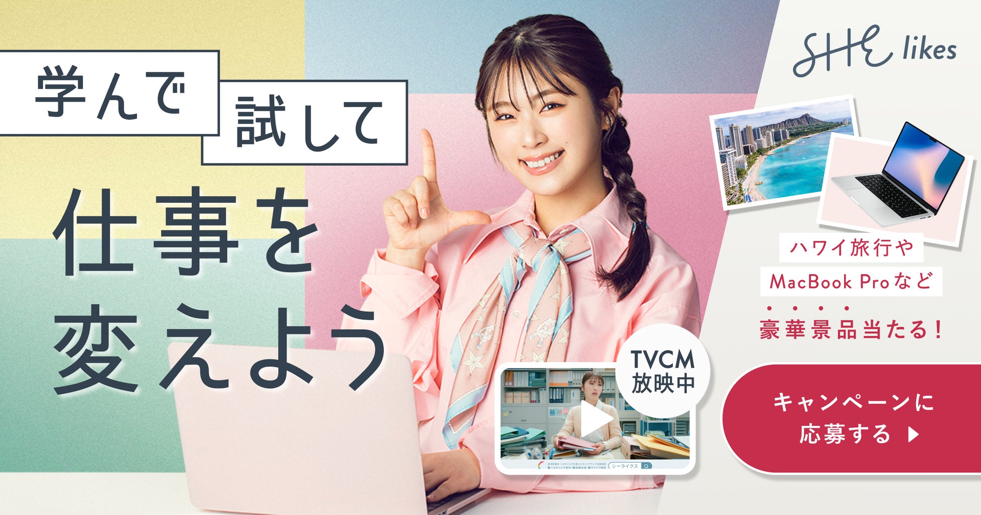 SHElikesは、時間や場所にとらわれずに働ける45以上の職種スキルが定額で学び放題の女性のためのキャリアスクールです。Webデザイン・Webマーケティング・ライティングなど、パソコンひとつで働けるデジタルスキルやクリエイティブスキルを幅広く学べ、私らしい働き方の実現を支援します。