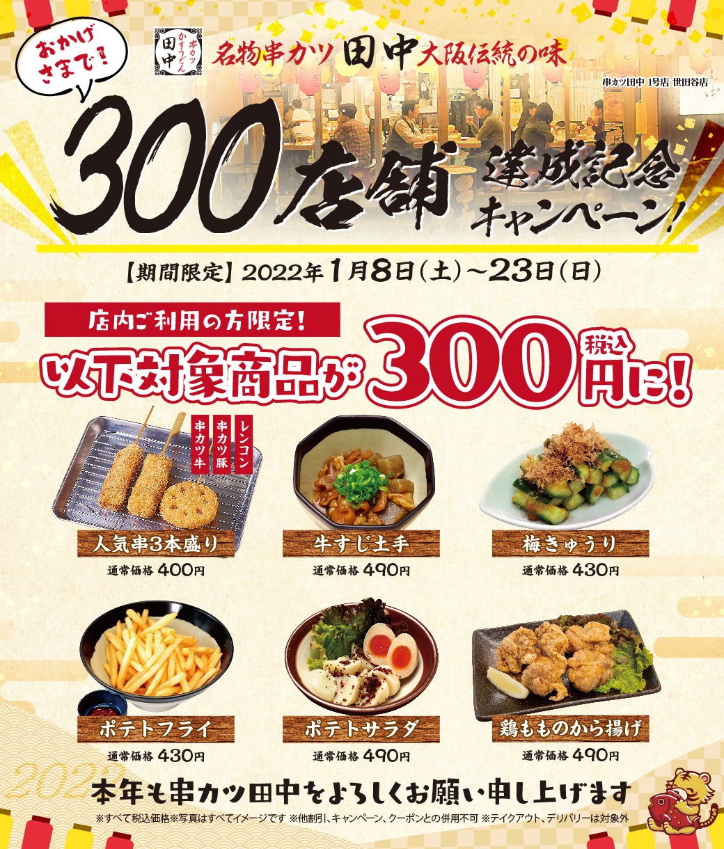 株式会社串カツ田中ホールディングス(本社:東京都品川区東五反田、代表取締役社長:貫 啓二、以下:串カツ田中)は、1月8日(土)~23日(日)の期間限定で対象商品を300円で提供いたします。