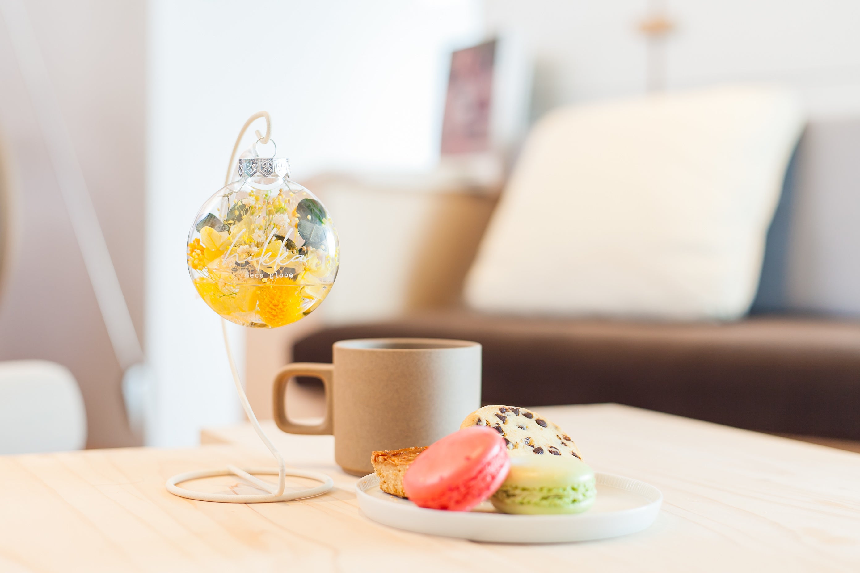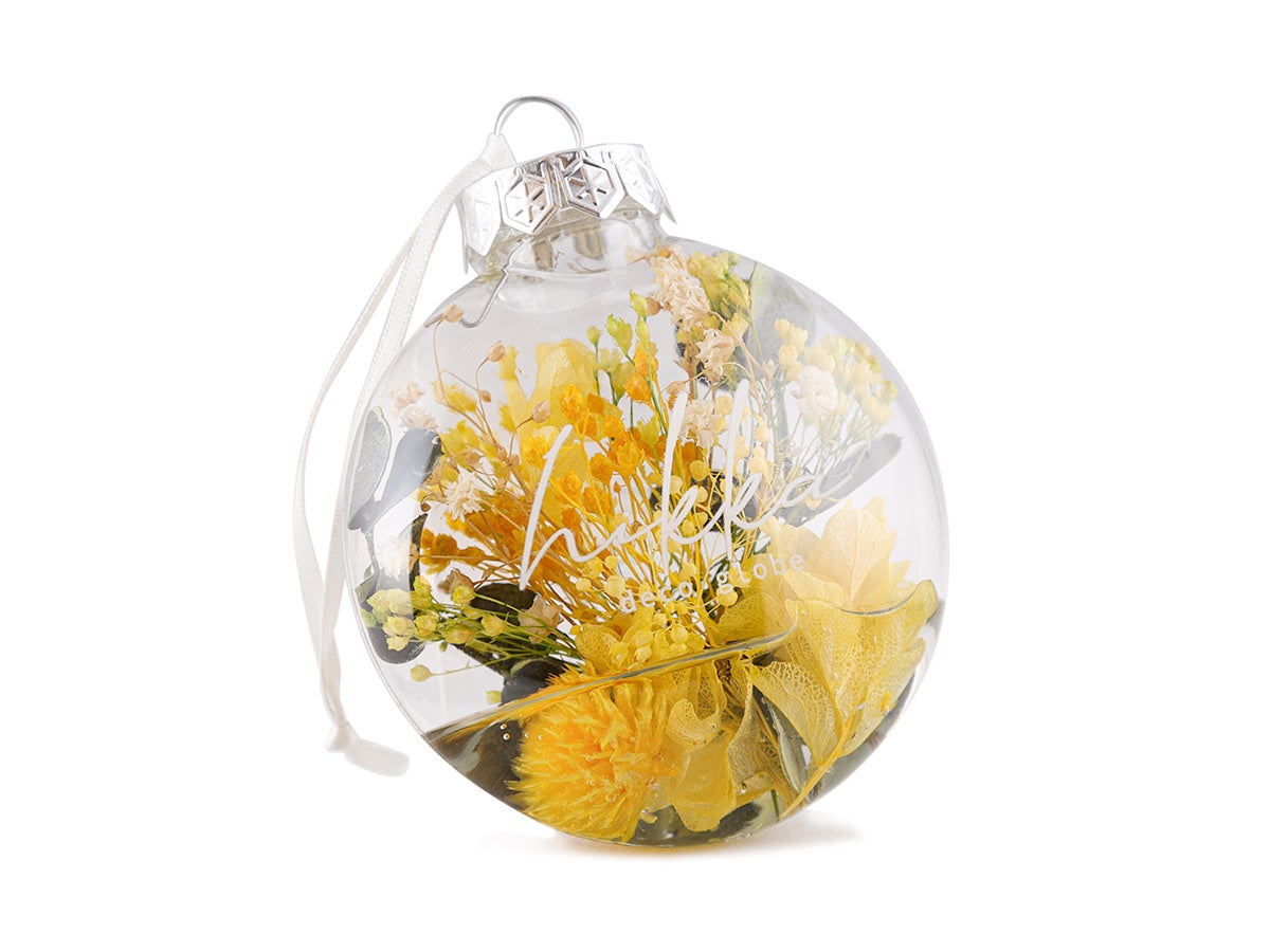 円形型オーナメントの中にプリザーブド&ドライフラワーを閉じ込めたオブジェ。