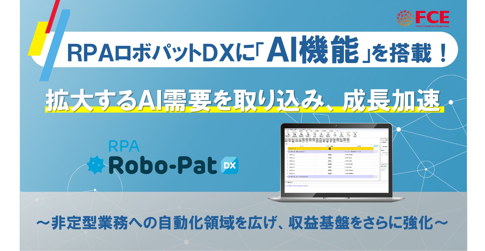 株式会社FCE(東京都新宿区、代表取締役社長:石川淳悦、証券コード:9564)は、「RPA Robo-Pat DX(以下、ロボパットDX)」において、AIを活用した新機能「AIオプション」を順次リリースすることを発表いたします。これにより、急速に高まるAI活用ニーズを取り込み、RPA市場における当社の競争優位性を一段と高めてまいります。