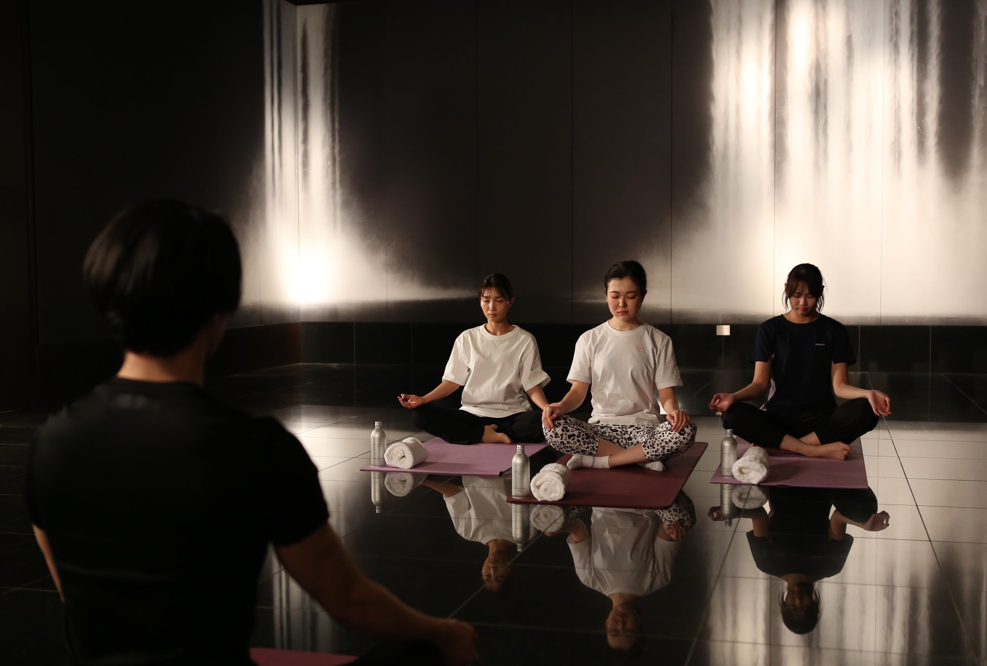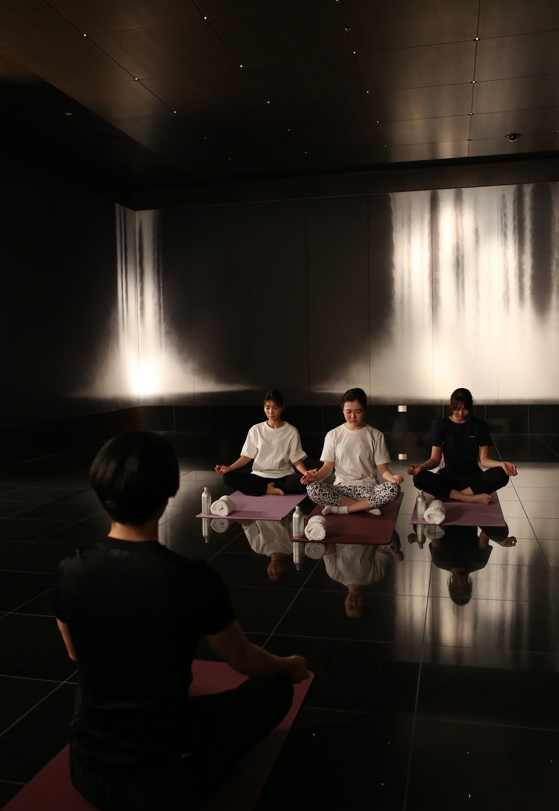 ご宿泊のお客様およびホテル内「Nagomi スパ アンド フィットネス」の会員を対象に実施する、心穏やかな状態で1日を過ごすための特別なウェルネスプログラムです。会場は、ホテル館内3階に位置する、日本画家 千住博氏によるアート「ウォーターフォール」に囲まれた、六本木の喧騒から離れた厳かな空間。黒大理石のフロアと黒い天井のこの空間に、まるで水の流れる音が本当に聞こえてきそうなダイナミックな滝の絵を配しています。プログラムでは、「Nagomi スパ アンド フィットネス」のトレーナーとともに、1日の始まりに最適なストレッチをしたあと、「Mindfulness in Tokyo」のアプリを用いて瞑想を体験することにより、身心の安定を図り、穏やかな状態へと導きます。