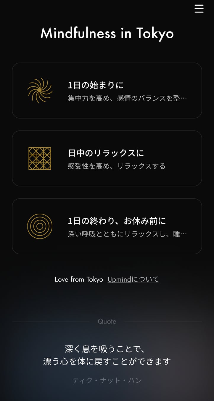 東京大学発の企業。”人々の人生を豊かにする”をビジョンに、科学的な効果検証を踏まえながら、マインドフルネス関連のサービスを監修・開発。主に100万ダウンロード超の国内最大のマインドフルネスアプリUpmindを開発(東京大学滝沢龍研究室と共同研究)し、他にも、東京建物・グランド ハイアット 東京等にサービスを提供。マインドフルネスが科学的に効果の実証されている健康習慣として認知・普及するよう取り組んでいます。最新情報はupmind.co.jpをご覧ください。Instagramで@upmind_jpをフォローください。