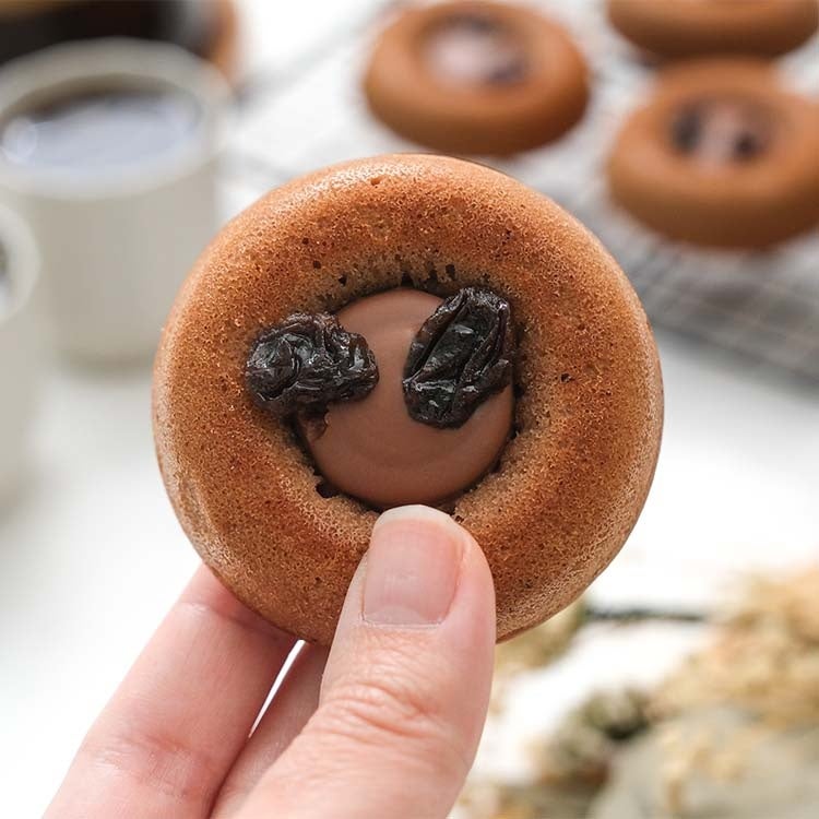 今回の新商品ではアーモンドプードルをたっぷり使用して焼き上げた生地に、チョコレートクリームを絞り、ラムレーズンをトッピング。