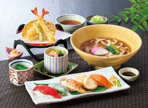 麺・天ぷら・寿司・茶わん蒸し・小鉢をセットにした「サガミのこだわり」を満喫できる商品です。