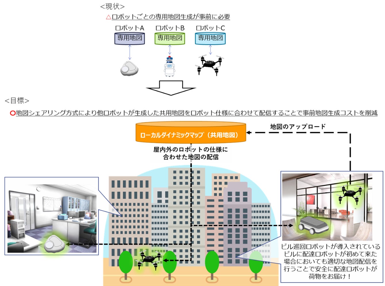 本研究では、両社の技術やノウハウを持ち寄り、「ロボ★メン」をユースケースとした、NTT西日本の地図シェアリング方式に関する技術の実用化に向けた有効性について実証・評価を行います。