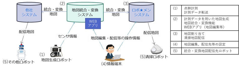 本研究では、今後普及が想定されるサービスロボット間で地図を共用するための地図シェアリング技術の確立のため、異なる時間帯または異なるロボットで生成された隣接地図を一つの地図に統合する地図統合技術、および、ロボット仕様に合わせた地図に変換する地図変換技術に関する実証・評価を行います。具体的には、実フィールドトライアルを通じて、本技術において統合・変換された地図を「ロボ★メン」サービスにおいて商用提供されているオフィス清掃ロボットやその他ロボットに配信し、それらロボットが清掃などの業務を完遂できるかなどのフィージビリティ評価に加え、現場スタッフがWEBアプリケーションを用いて地図統合・変換などの操作を問題なく遂行できるかなどのユーザビリティ評価を行います。