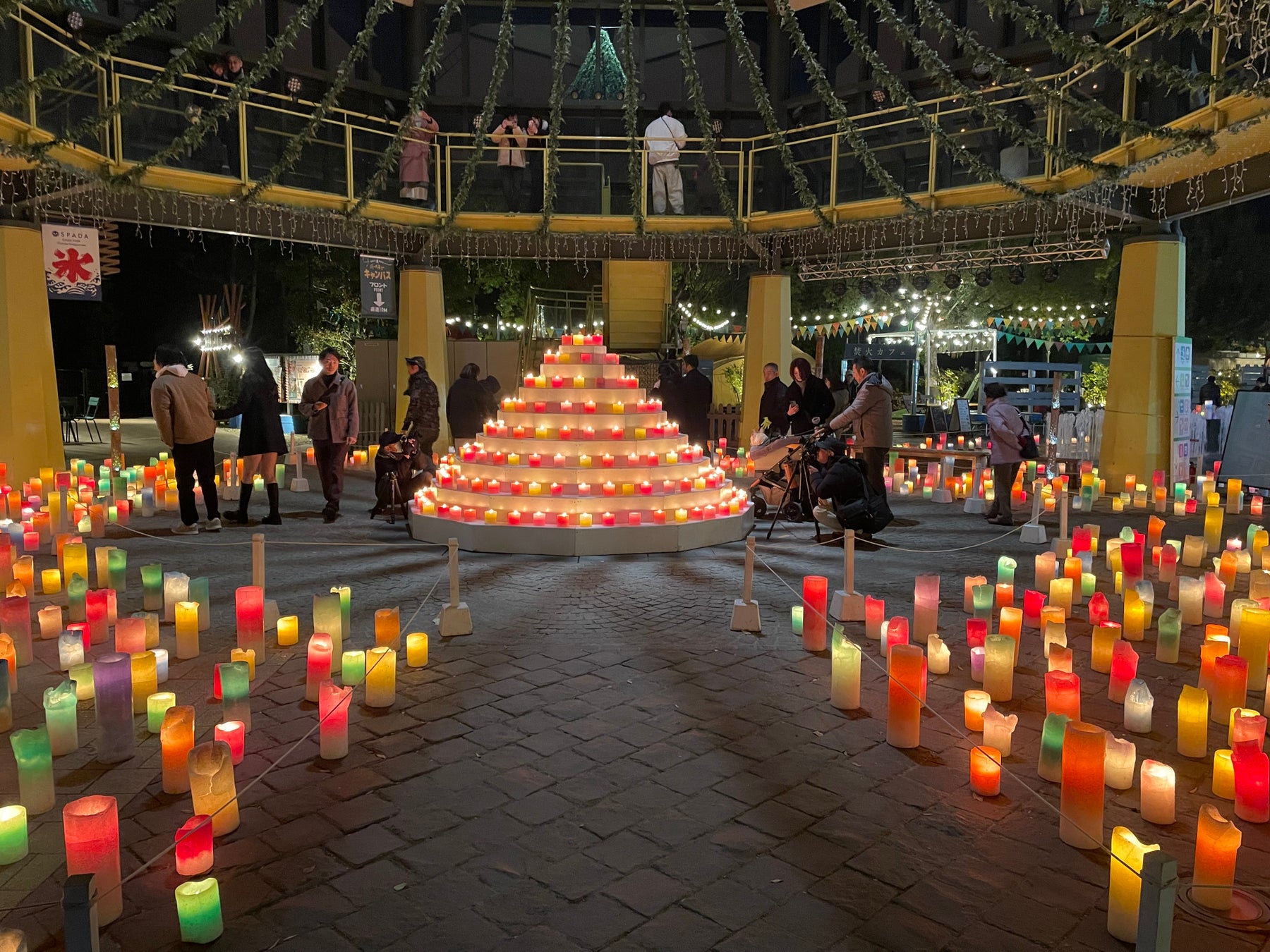会場であるオアシスパークのガラスドームとにじいろ噴水広場に1600本のキャンドルを展示。