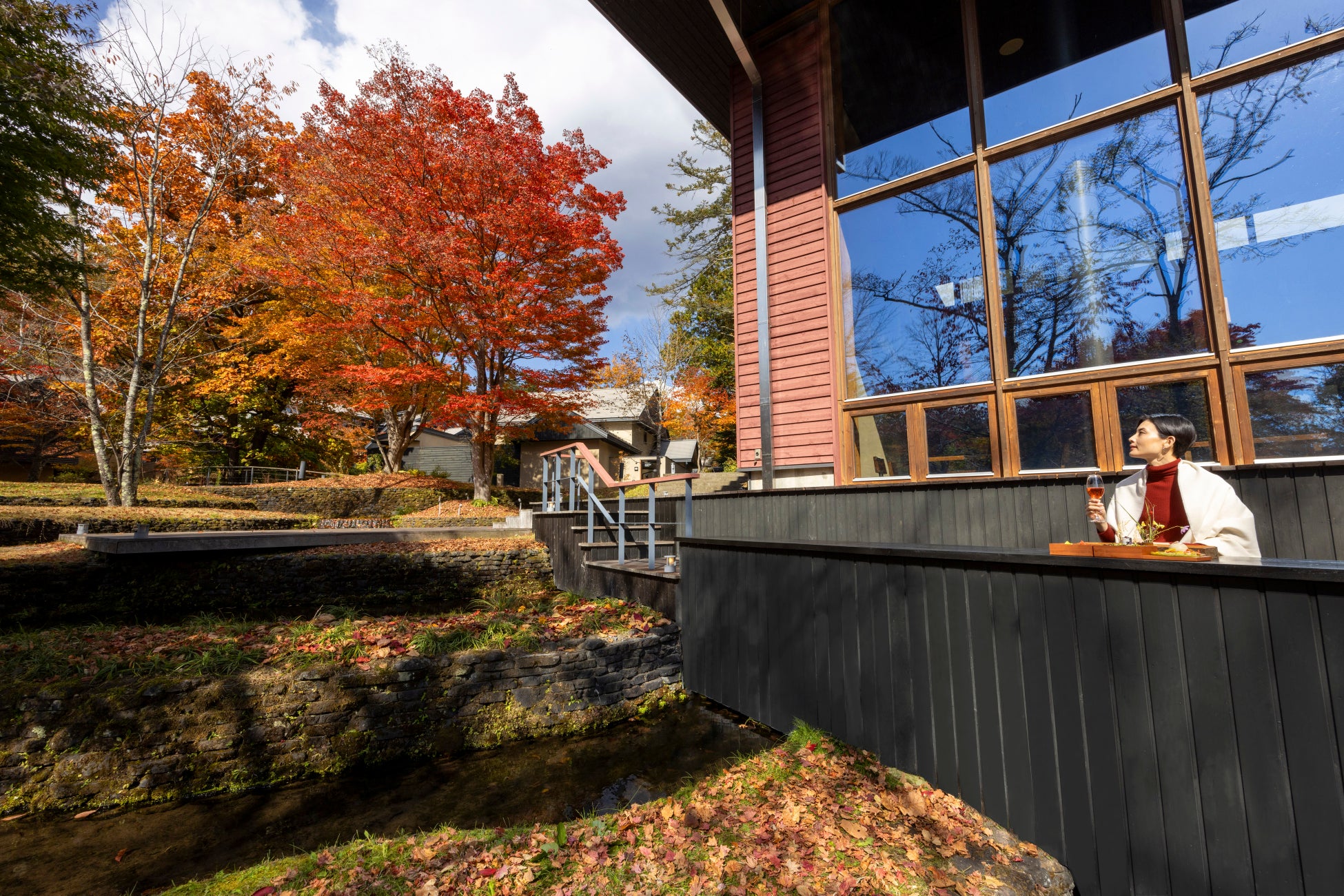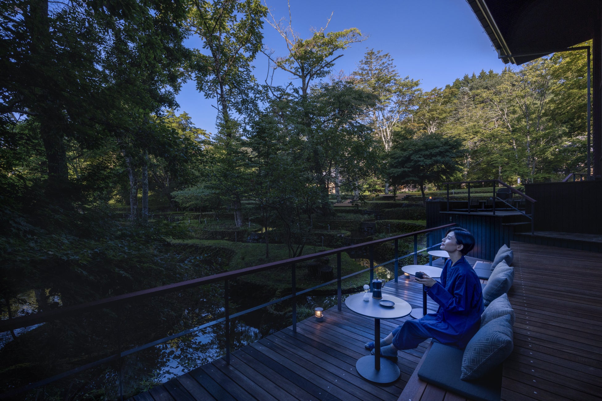 ⾕の集落に滞在する。離れの客室は⽔辺を囲み、部屋のテラスからは季節のうつろいが感じられます。「軽井沢野⿃の森」に⾯した豊かな⾃然環境にて、休息の時間を満喫できる滞在型の宿泊施設です。