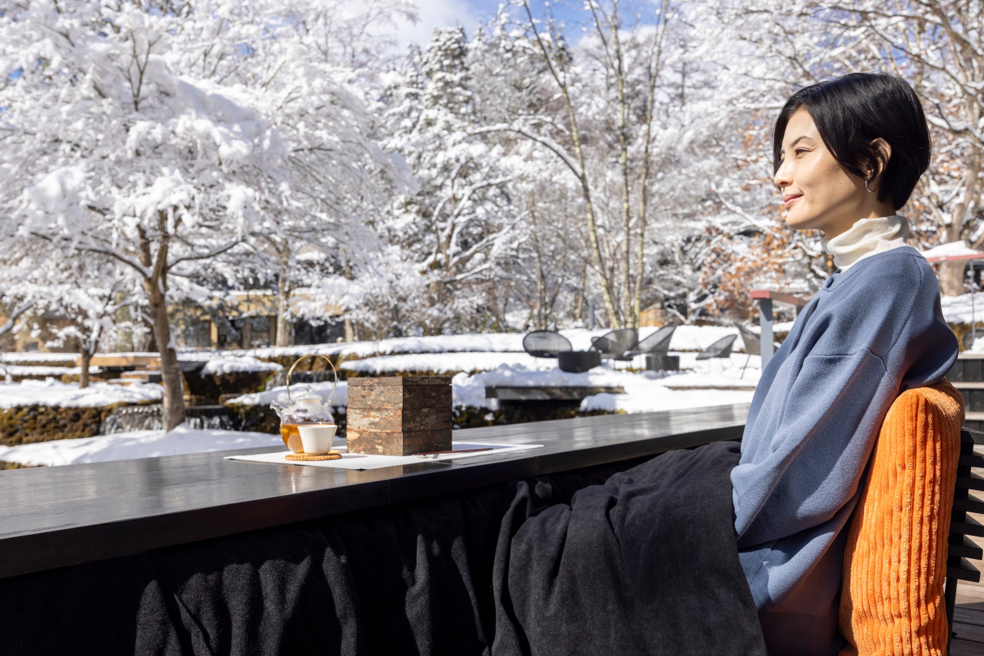 星のや軽井沢の谷の集落は、「もっと日本らしさを大切にしながら近代化したとしたら」、「和の文化が熟成を重ねて今を迎えていたとしたら」といった、空想の「もう一つの日本」を思い描き創られました。集落中央に位置する棚田の風景もまた「もう一つの日本、谷の集落」における心の原風景として設計されたランドスケープです。その棚田を異なる角度から臨む特等席「棚田ラウンジ」を用意します。棚田ラウンジには3つの異なるロケーションとして、棚田の中央の緑に囲まれたのプライベートデッキ、棚田の景色を見上げるように楽しむ掘りごたつ、開放的で棚田全体を見渡せるテラスを設置。過ごす場所で異なる季節の繊細な移り変わりを楽しめる全28席のラウンジです。また春には野鳥の声、夏には新緑の木漏れ日、秋には色づく黄葉の階調、冬には一面に広がる雪景色など、季節の移ろいを間近で感じることができます。