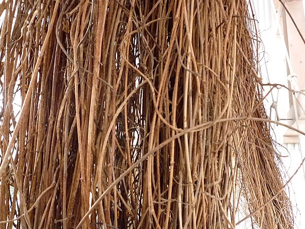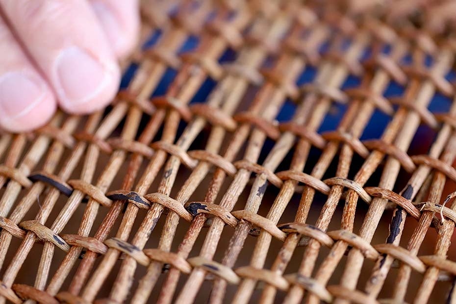 あけび細工に使われるツルは、山野に自生するものの中でも、地面を這うようにまっすぐ伸びた部分だけを選んで使用します。木に巻き付いた曲がりくねったツルではなく、素直に伸びたものが素材として適しているのです。しかし、採取してきたばかりのツルは、太いものもあれば細いものもあり、色合いや品質も実にさまざま。ここから不純物を取り除き、太さを選別し、編みやすい状態へ整えていく「材料取り」の工程が、実は最も手間と時間を要する大切な仕事です。この下準備なくして、美しいあけび籠は生まれません。