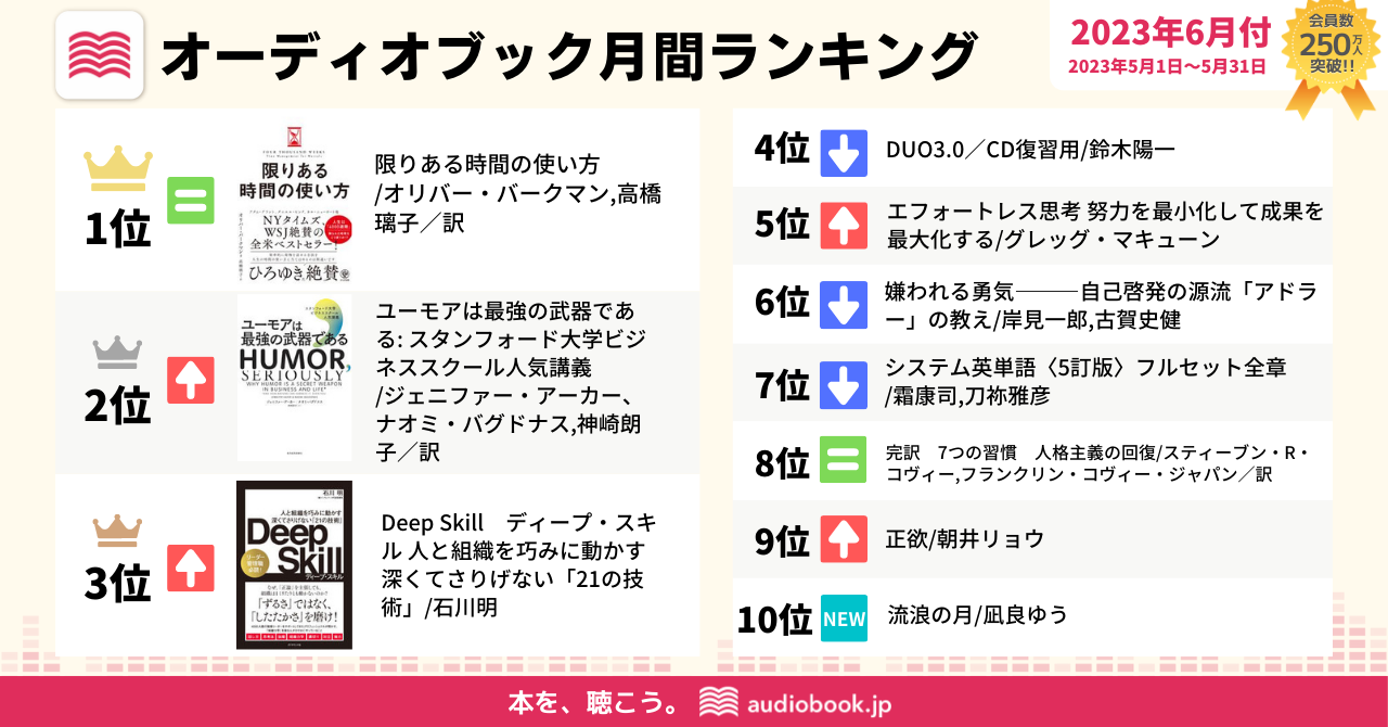 【オーディオブック6月人気ランキング】全米衝撃のベストセラー『限りある時間の使い方』が2ヵ月連続1位。ビジネスに必要な仕事術や教養が人気!ビジネス書籍ラインナップ数 日本一のaudiobook.jp