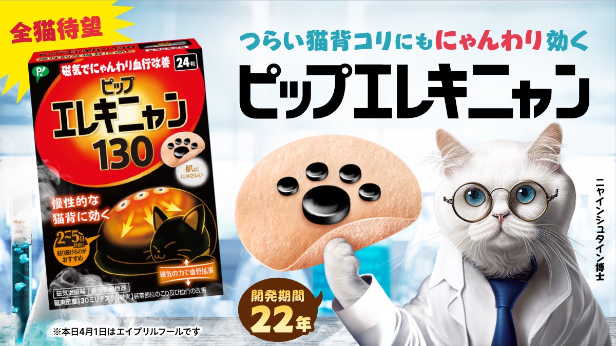 ピップ株式会社(本社:大阪市中央区、代表取締役社長:松浦由治)は、磁気の力で血行を改善する磁気治療器「ピップエレキバン」シリーズから、開発期間22年の時を経て、猫背コリ解消に一石を投じる画期的な新商品「ピップエレキニャン」を発売します。
