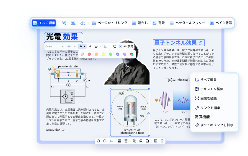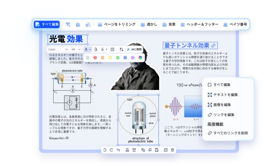 テキストの追加・修正に加え、カーニングや行間、フォントスタイルなどの細かな書式設定にも対応。レイアウト全体を柔軟に調整でき、PDFを思い通りに編集可能です。