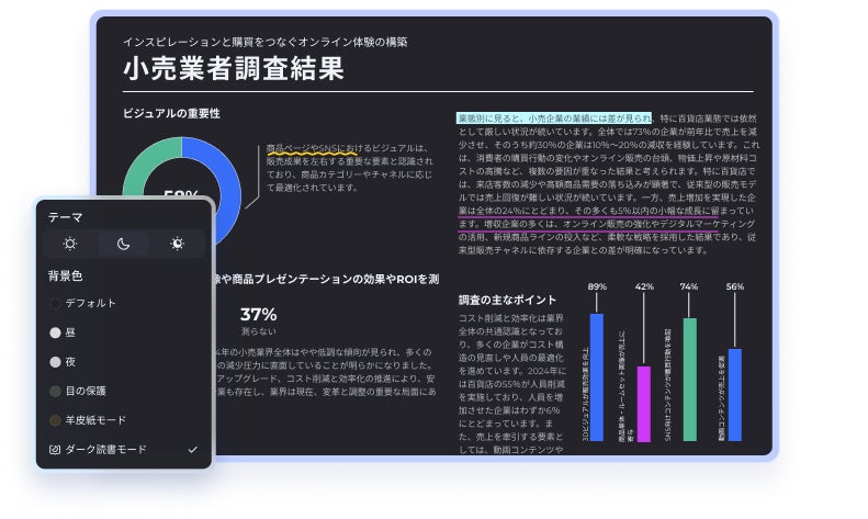 ナイトモード、ペーパーモード、アイケアモードなど複数の表示テーマを搭載。長時間の閲覧でも目に優しく、用途に応じた最適な読書環境を提供します。