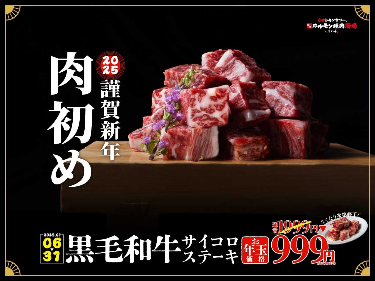 GOSSO株式会社(本社:東京都渋谷区、代表取締役:藤田建)は、2025年1月6日(月)から1月31日(金)まで、「0秒レモンサワー®仙台ホルモン焼肉酒場 ときわ亭」(一部店舗を除く)で、「黒毛和牛サイコロステーキ」を数量限定で特別価格の999円(税抜)にてご提供するイベント『2025年 謹賀新年 肉初め』を開催いたします。https://store.zero-tokiwa.com/