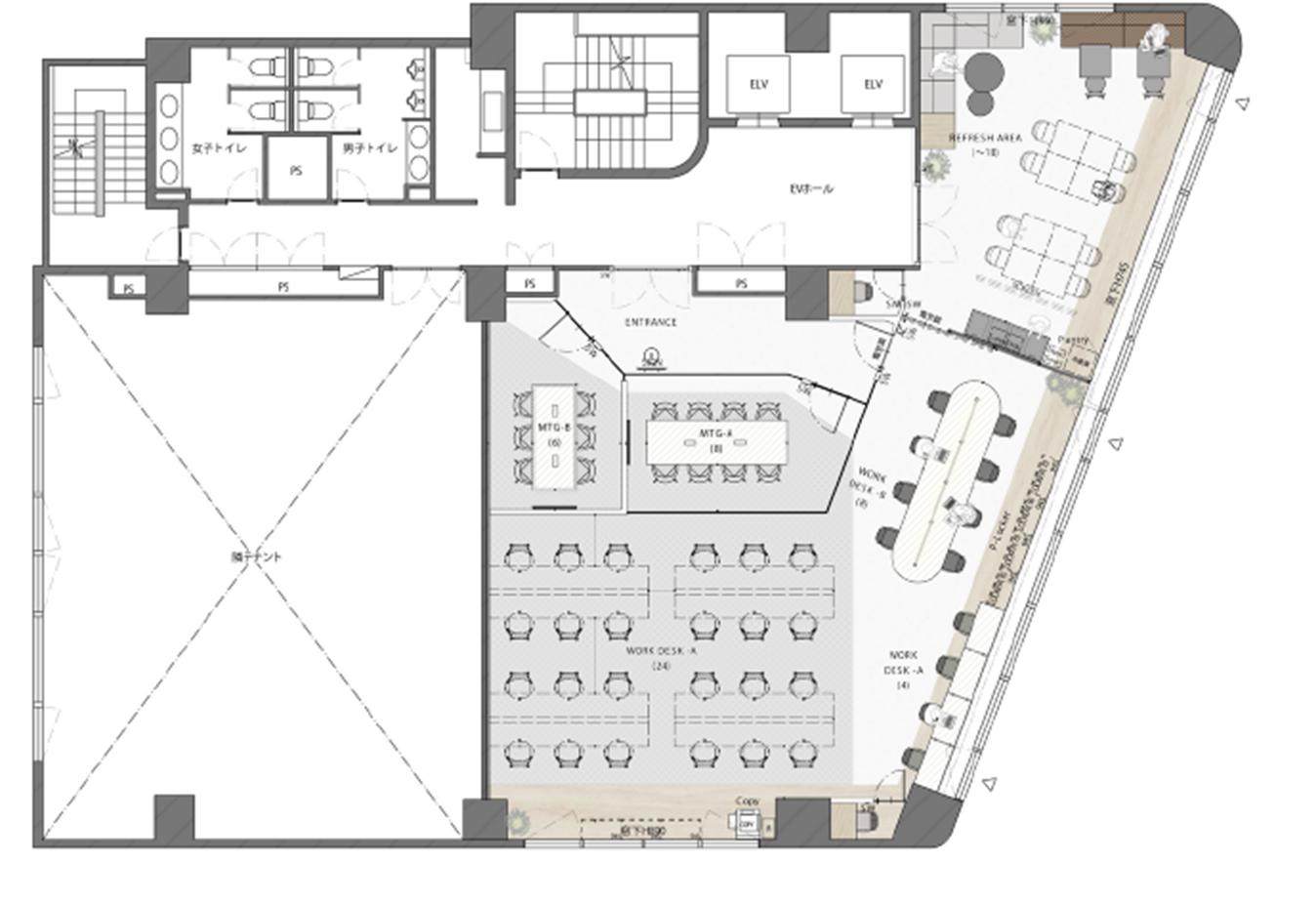 従業員用の執務デスクはあえて用意せず、ご入居者様にご用意いただくようにすることで、従業員の増加などに柔軟にご対応いただけるハーフセットアップオフィスです。