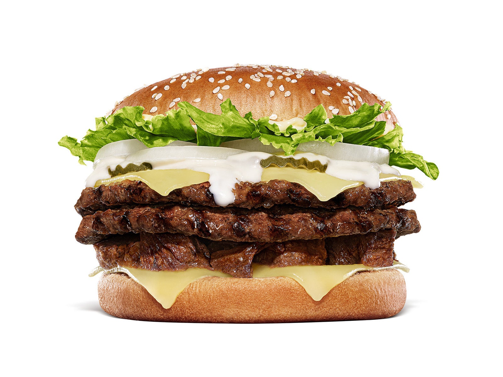 『ホワイトチーズマウンテンズ ダブルビーフ』は、バーガーキング® 自慢の直火焼きの100%ビーフパティ2枚に、フレッシュなオニオンと味のアクセントのピクルス、まろやかな味わいのゴーダチーズスライスを贅沢に4枚重ねました。マヨソースとたっぷりのミルキーなホワイトチーズソースで仕上げた、ボリューム満点のチーズバーガーです。