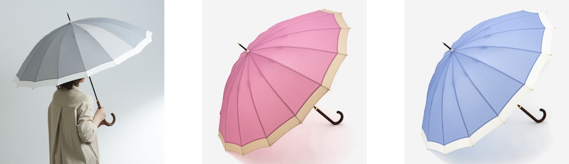 2019年9月に発売し、累計3万4,000本を超える人気シリーズに、新色のローズピンク、ライトブルーが登場。開いたときも閉じたときも形が美しい16本骨の傘です。開いたときに傘の形が正円に近くなることで覆う面積が増え、雨の日に頼れる1本です。親骨には、軽くて高強度のグラスファイバーを使用しています。