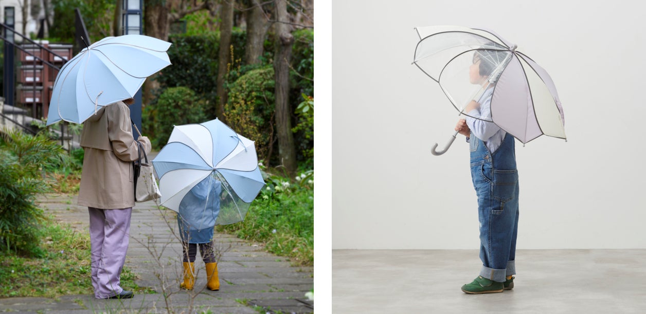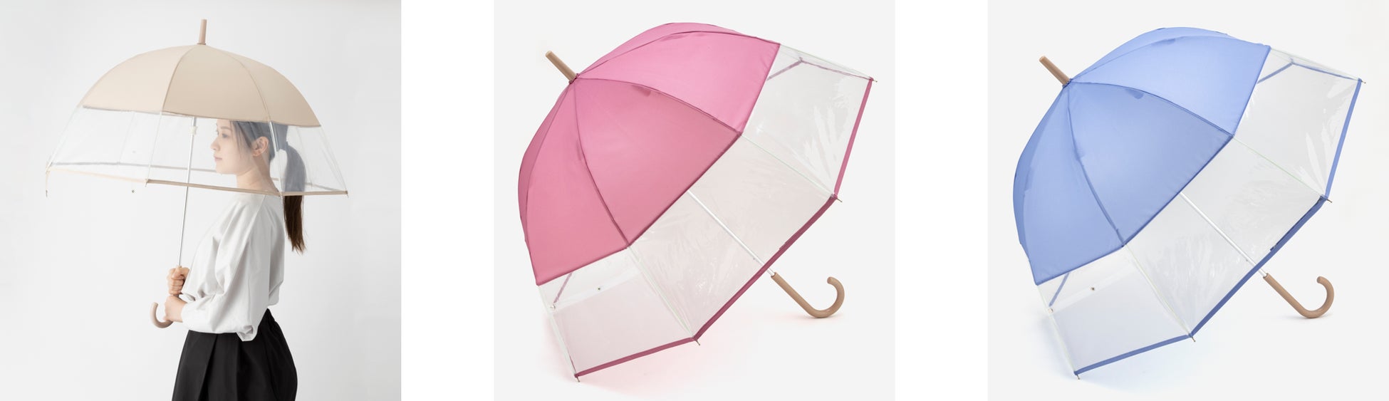 2021年2月に発売し、累計販売数2万8,000本を超える人気シリーズに、新色のローズピンク、ライトブルーが登場。撥水生地とビニール生地を組み合わせることで軽やかな印象に仕上げ、撥水性はもちろん、ビニール部分からは前が見えやすいという安全性も兼ね備えたハイブリッド傘です。