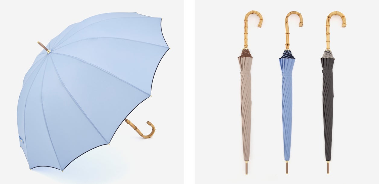 「雨傘としても日傘としても、使いやすい1本を作りたい」との思いから開発した、竹の手元が上品な晴雨兼用傘もリニューアル。新色としてライトブルーが登場。フチにゴールドの糸でオーバーロック刺繍を施し、さらに高級感がアップしました。開いたときも閉じたときも形が美しい12本骨は、開いたときに傘の形が正円に近くなることで覆う面積が増え、雨の日でも安心です。また、親骨の長さを55cmとややコンパクトに仕上げ、日傘としても持ち運びしやすいサイズ感です。ハンドル部分には本物の竹を使用しており、1本1本節の違いを楽しむことができます。