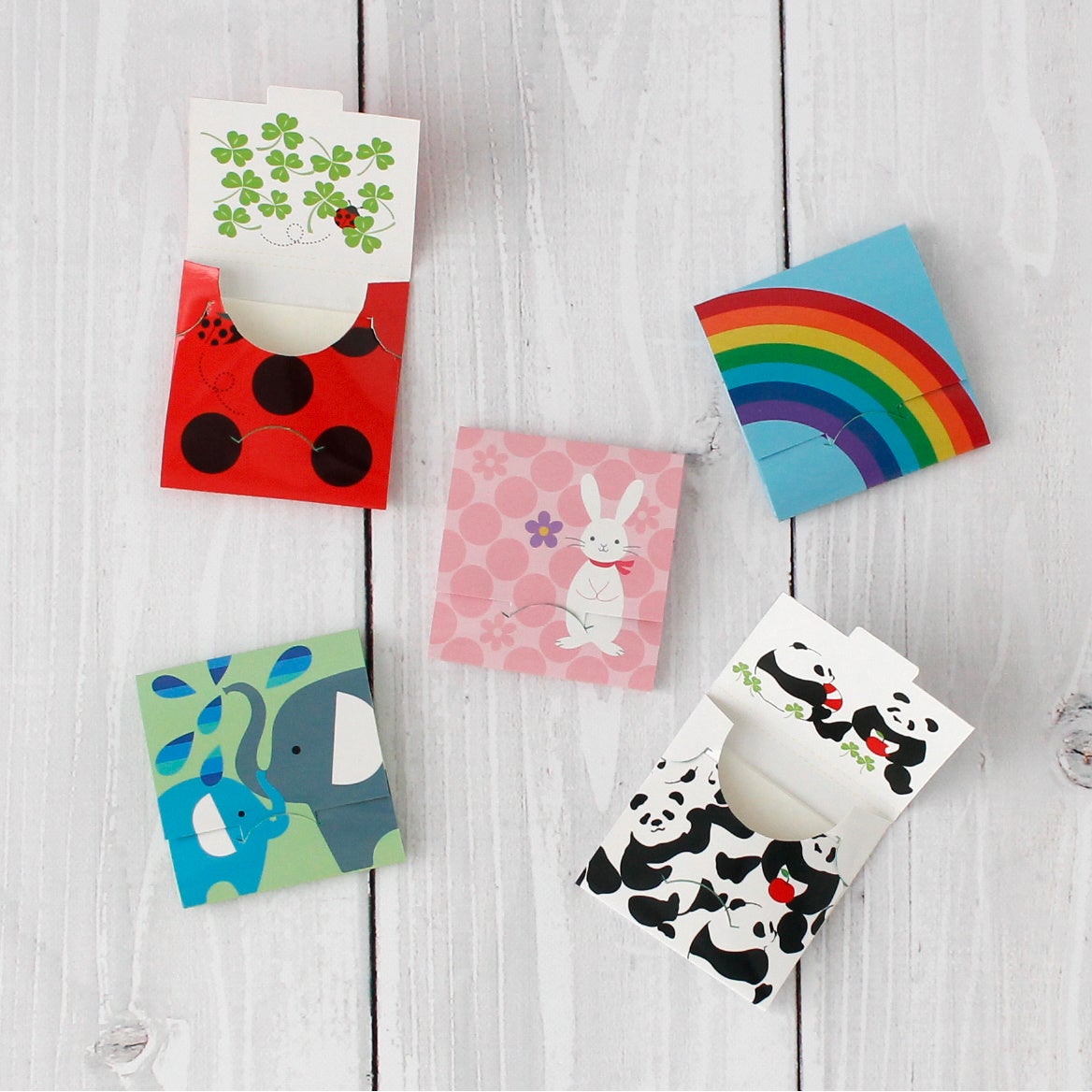 ③5種類のパッケージは開けると物語が描かれています。タオルハンカチとお揃いで持っても楽しいアイテム。
