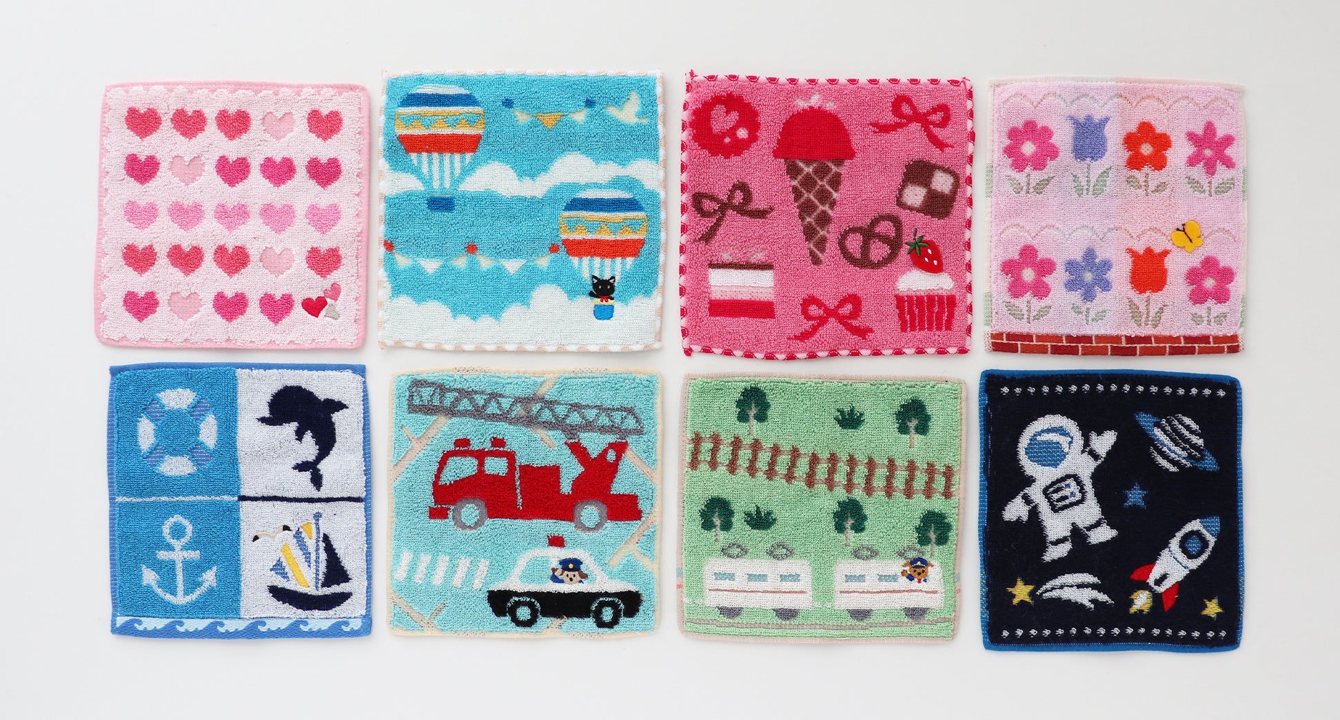 2006年に「ハンカチ屋さんがキチンとつくるハンカチ」をコンセプトに生まれたブルーミーズ。これまで、遊んで学べる英語シリーズや穴あきハンカチ、ポケットにぴったりのミニタオル、抗菌性の高い特殊な糸を使用したタオルハンカチなど、幅広いデザインと多数のバリエーションを展開しています。