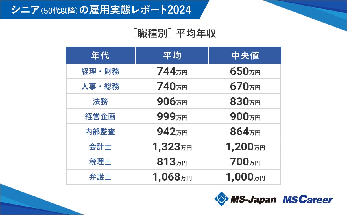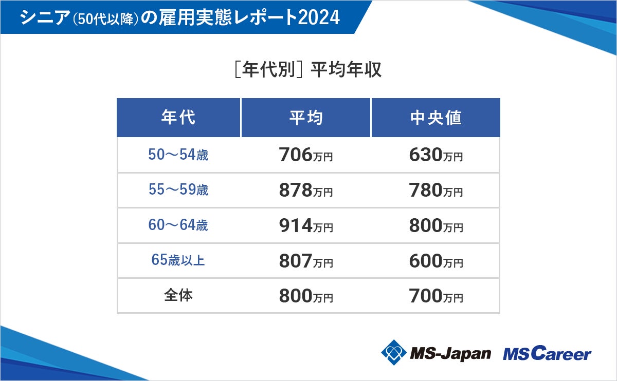 MS-Japanが「シニアの雇用実態レポート2024」を公開。シニアの平均年収は800万で、「60代前半に年収のピーク」を迎える。