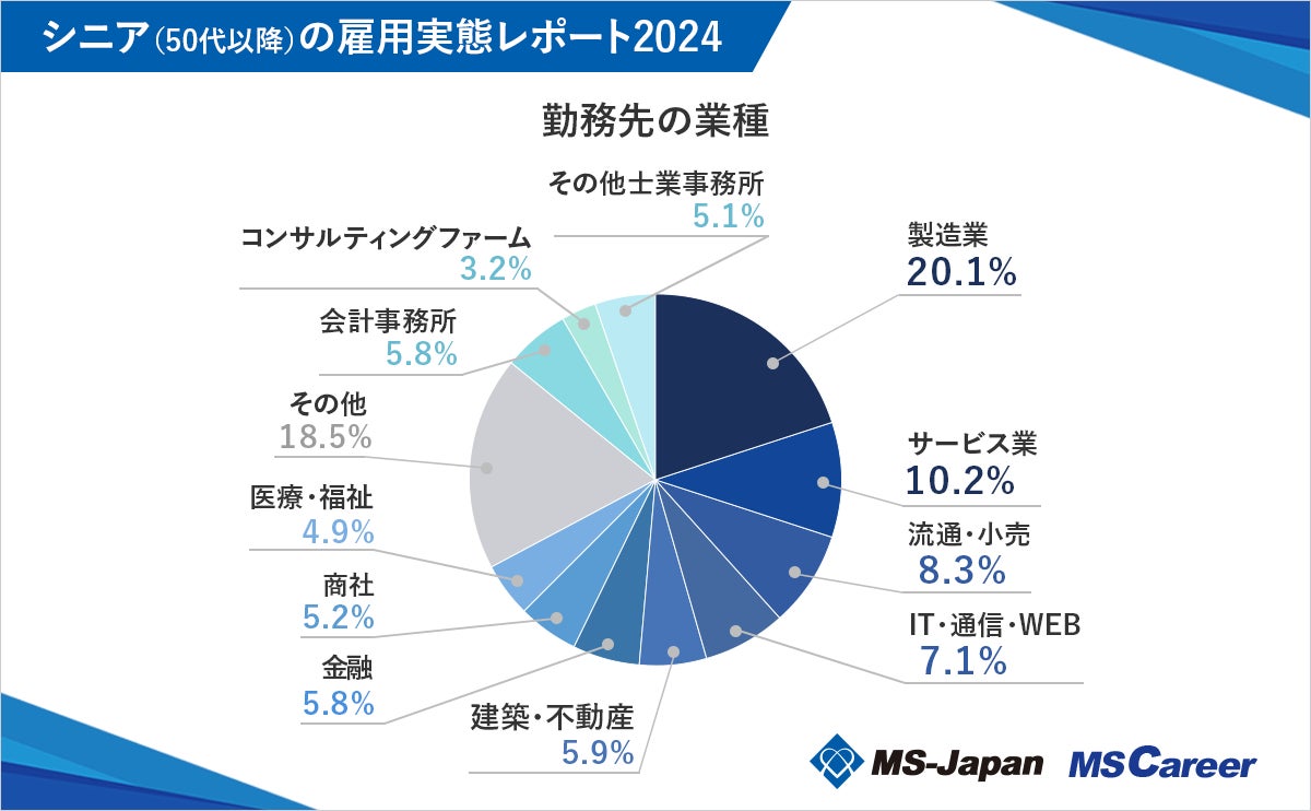 続いて、シニア世代の現在の勤務先の業種に関する調査では、「製造業(20.1%)」が最多で、ついで「サービス業(10.2%)」、「流通・小売業(8.3%)」と続きました。