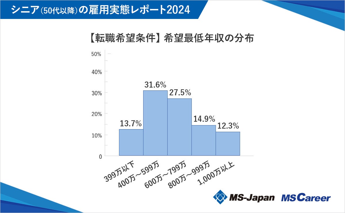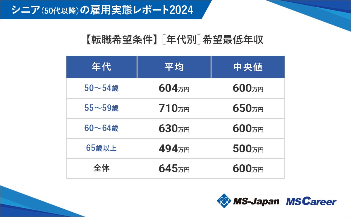本調査では、50代以降をシニアと定義し、MS-Japanが提供する人材紹介サービス「MS Agent」の2023年8月~2024年7月の登録者データから、シニア層の現年収等の雇用実態と転職の希望条件をまとめました。
