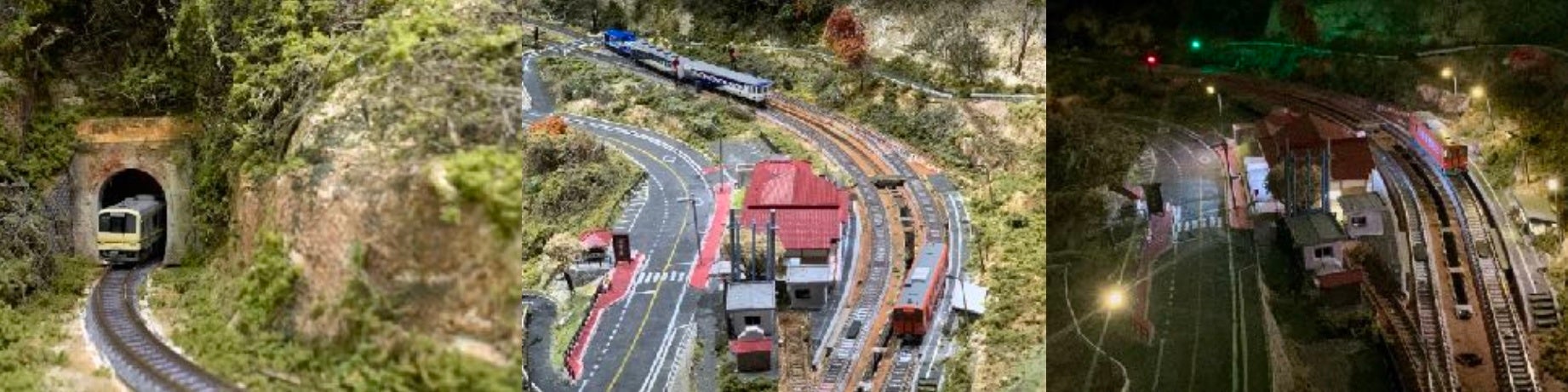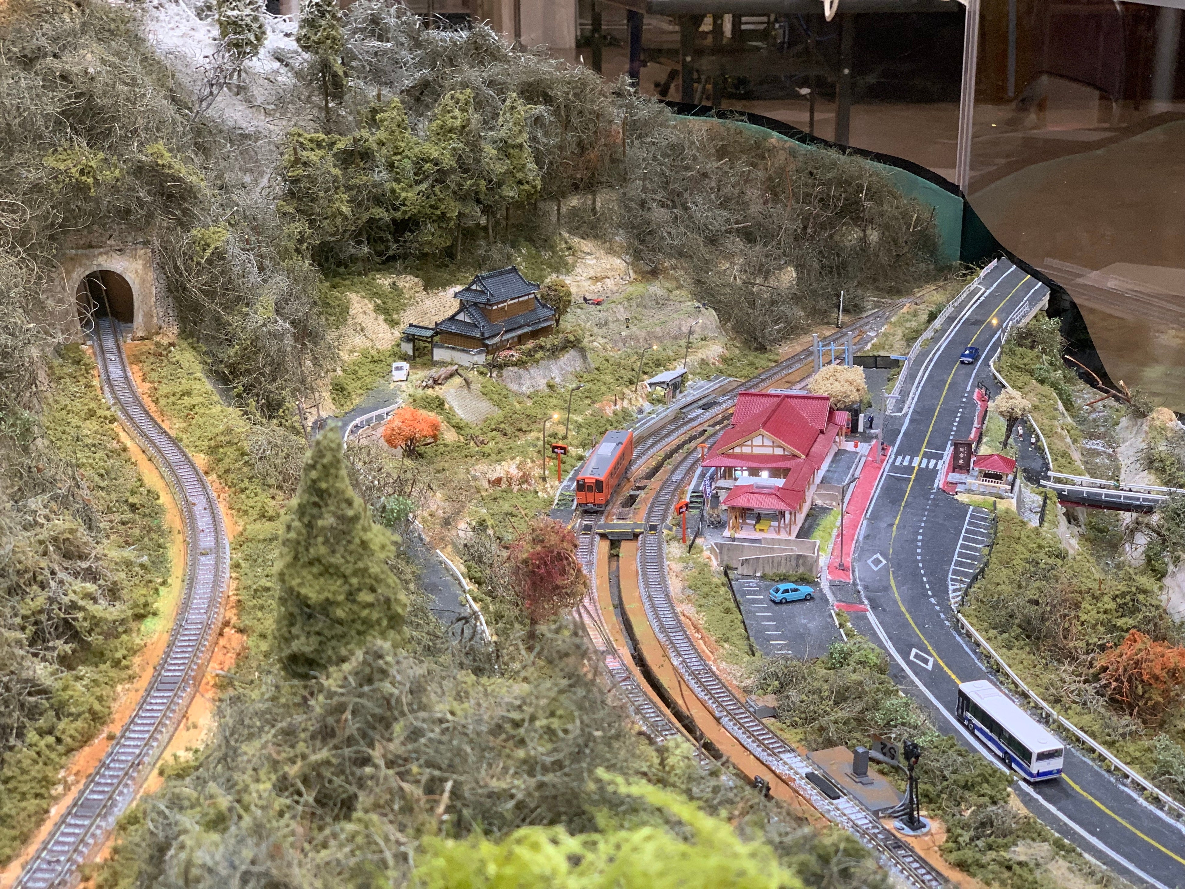 江上さんは、マンガの取材で訪れた奥出雲で出雲坂根のスイッチバックに出会い、惚れ込んだのをきっかけにジオラマを作りはじめました。近寄って見ると、線路だけではなく、駅舎や道路、山肌など、まわりの景色の細かいところまでとても緻密に作り込まれているのがわかります。信号や街灯、駅舎内のあかりが点る夜景も、大スケールの迫力とはまたちがうロマンチックな景色です。ぜひ実物をご覧になってください。