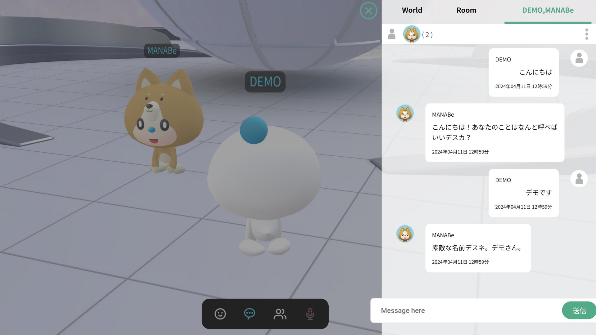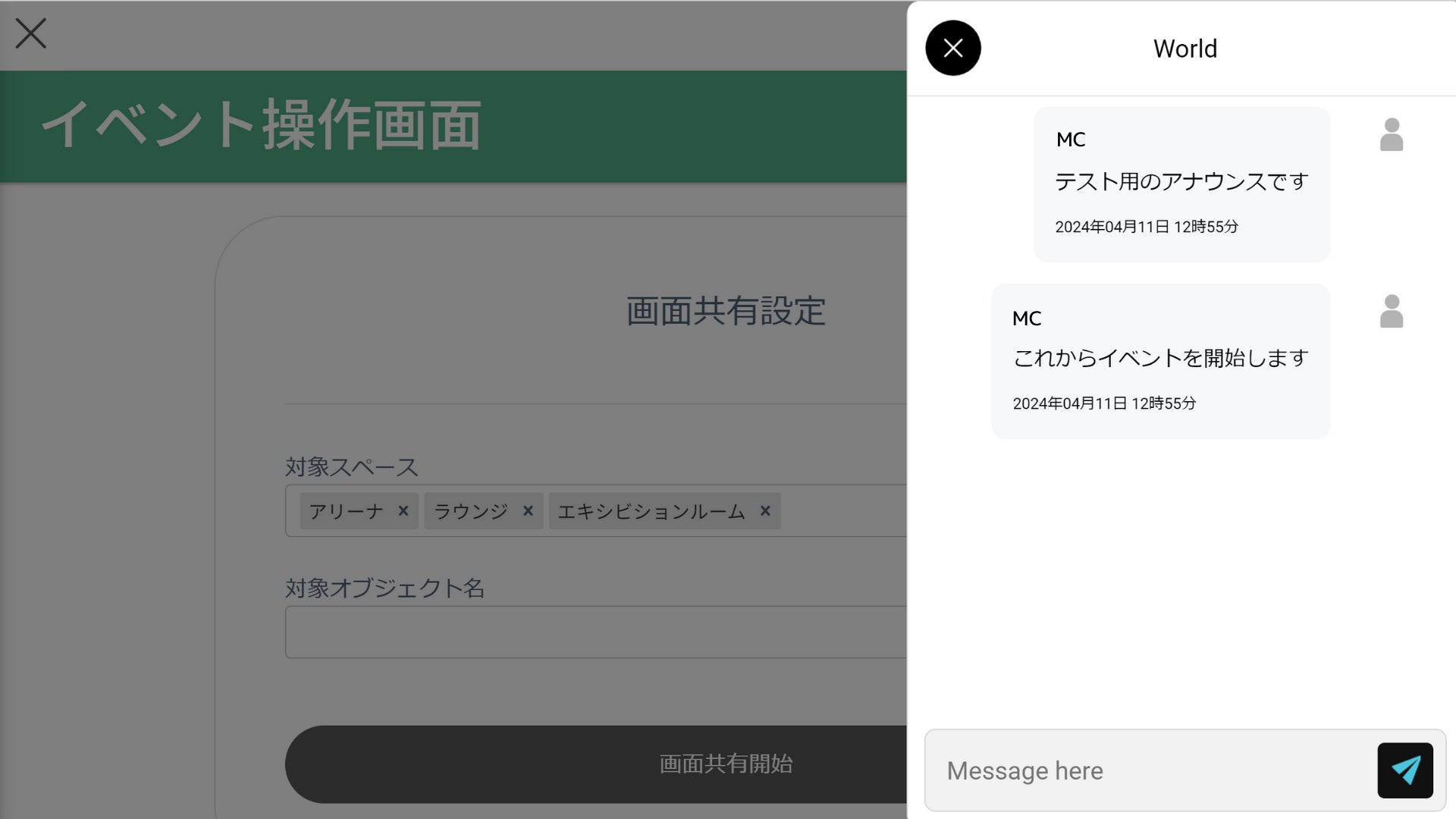 ②バーチャル空間内のスクリーン一括操作と「ワールドチャット」機能