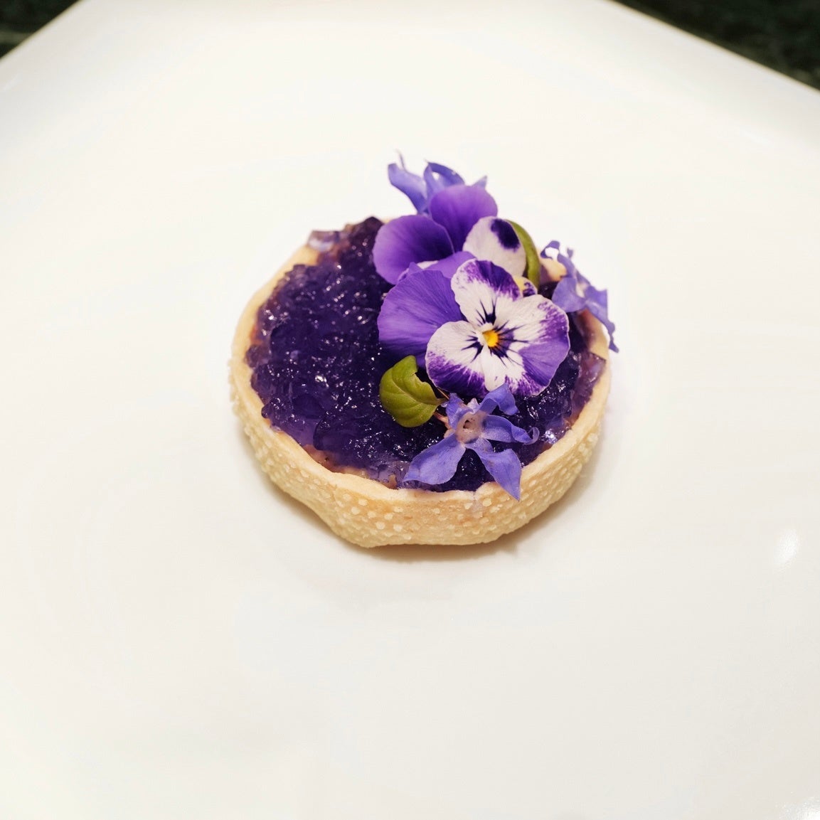 香ばしく焼き上げた焼き茄子と、京都老舗味噌屋「山利」の白味噌のコクに、ローズマリー香るバタフライピーのジュレをアクセントに重ねたタルトです。
