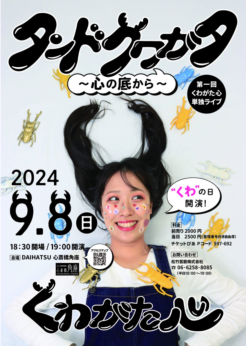 松竹芸能シン・かわいい女性ピン芸人 くわがた心が自身初となる単独ライブ「タンドクワガタ~心のそこから~」を2024年9月8日(日)【くわの日】にDAIHATSU 心斎橋角座にて開催いたします。
