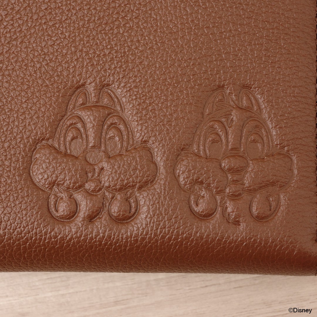 「チップ」「デール」が仲良しの総柄アートを全面にプリントされたスマホショルダーはベージュとブラウンで同系色の配色が落ち着いた印象に。