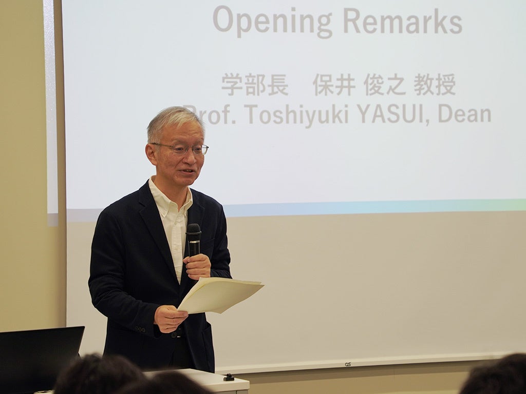 冒頭に、保井学部長が卒業プロジェクトに取り組む意義や目的について説明し、本ワークショップでできる限り多くの教員と対話をすることで、自らのアイデアを深めるようアドバイスがありました。