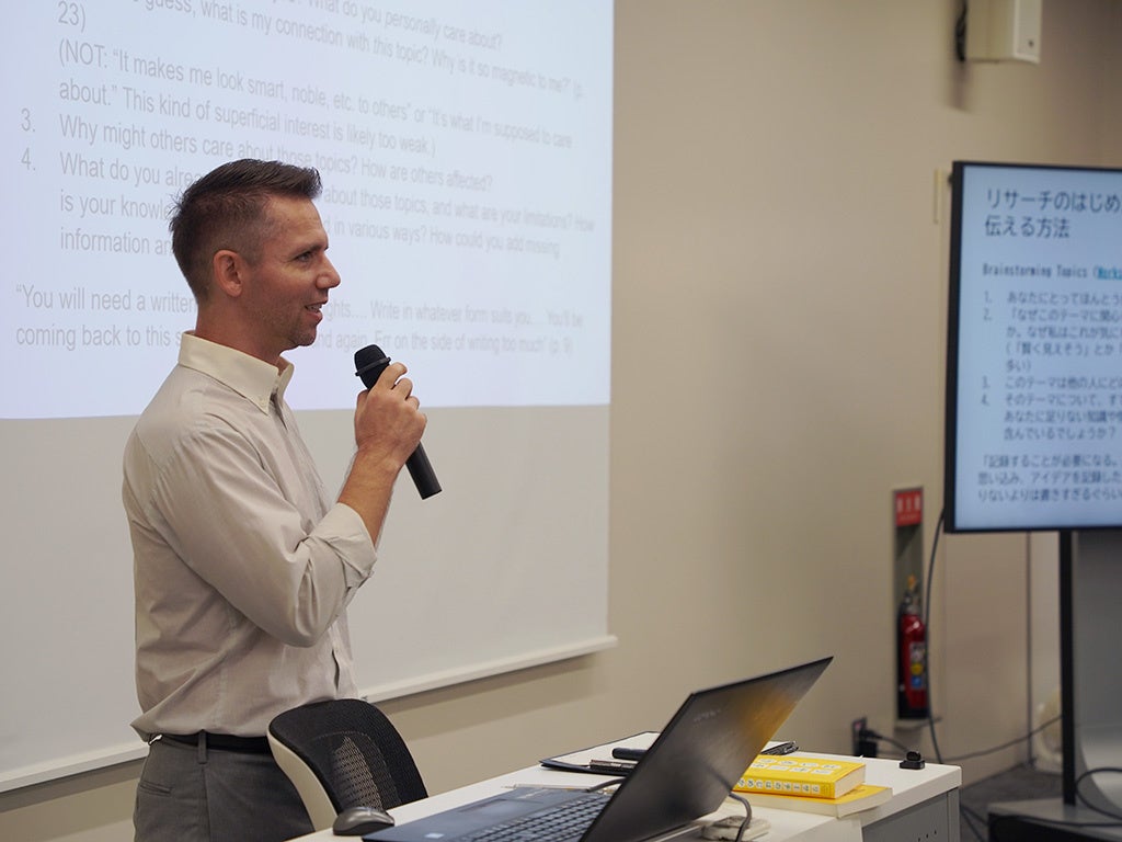 最初に、KASPAREK Nick准教授による「問いを立てるセッション」が開催され、リサーチの始め方について説明がありました。