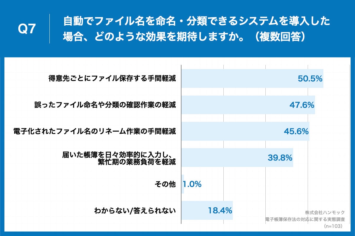 Q7.Q5で「全て自動化されている」と回答した方以外に、自動でファイル名を命名・分類できるシステムを導入した場合、どのような効果を期待しますか。(複数回答)」(n=103)と質問したところ、「得意先ごとにファイル保存する手間軽減」が50.5%、「誤ったファイル命名や分類の確認作業の軽減」が47.6%、「電子化されたファイル名のリネーム作業の手間軽減」が45.6%という回答となりました。