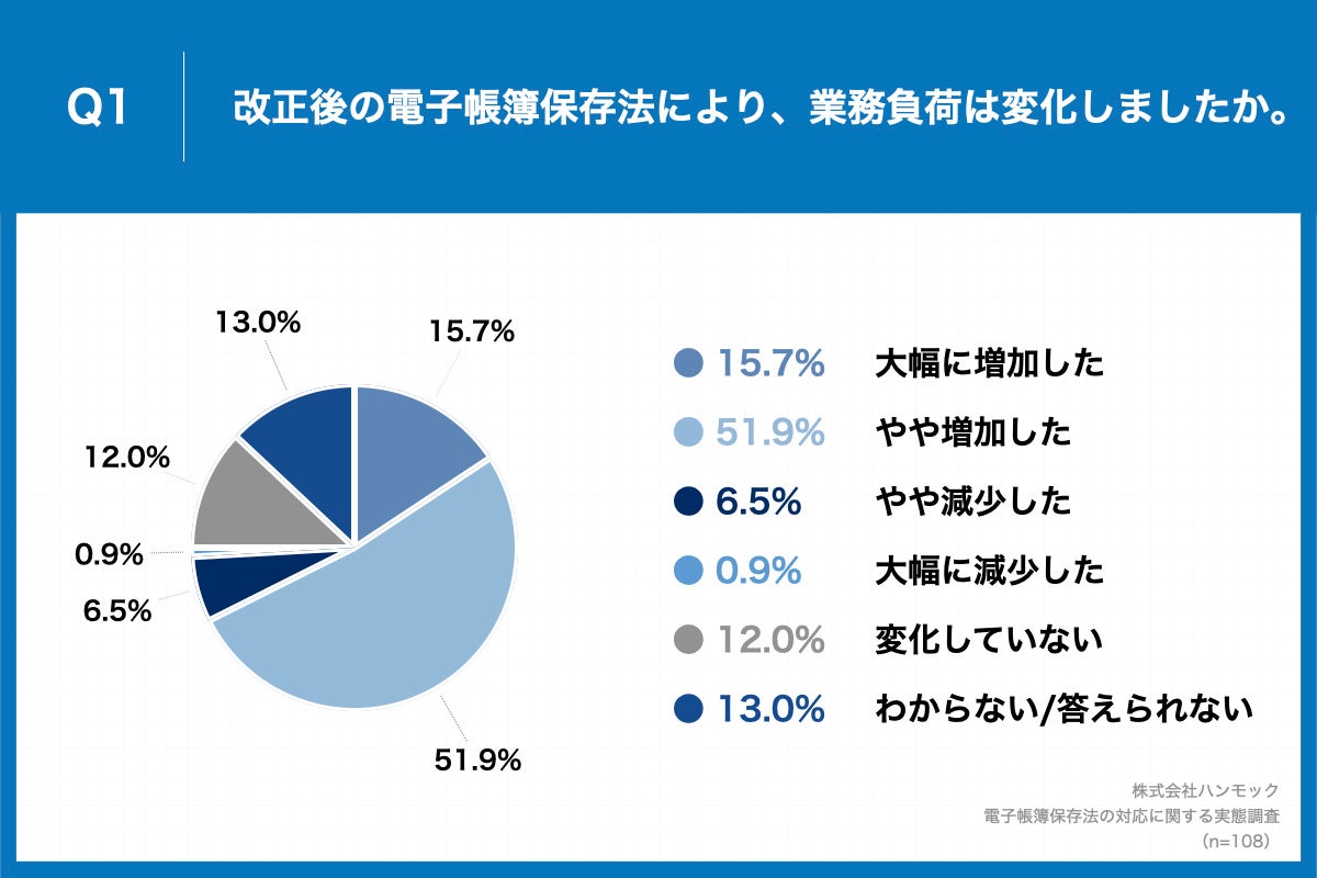 「Q1.改正後の電子帳簿保存法により、業務負荷は変化しましたか。」(n=108)と質問したところ、「大幅に増加した」が15.7%、「やや増加した」が51.9%という回答となりました。