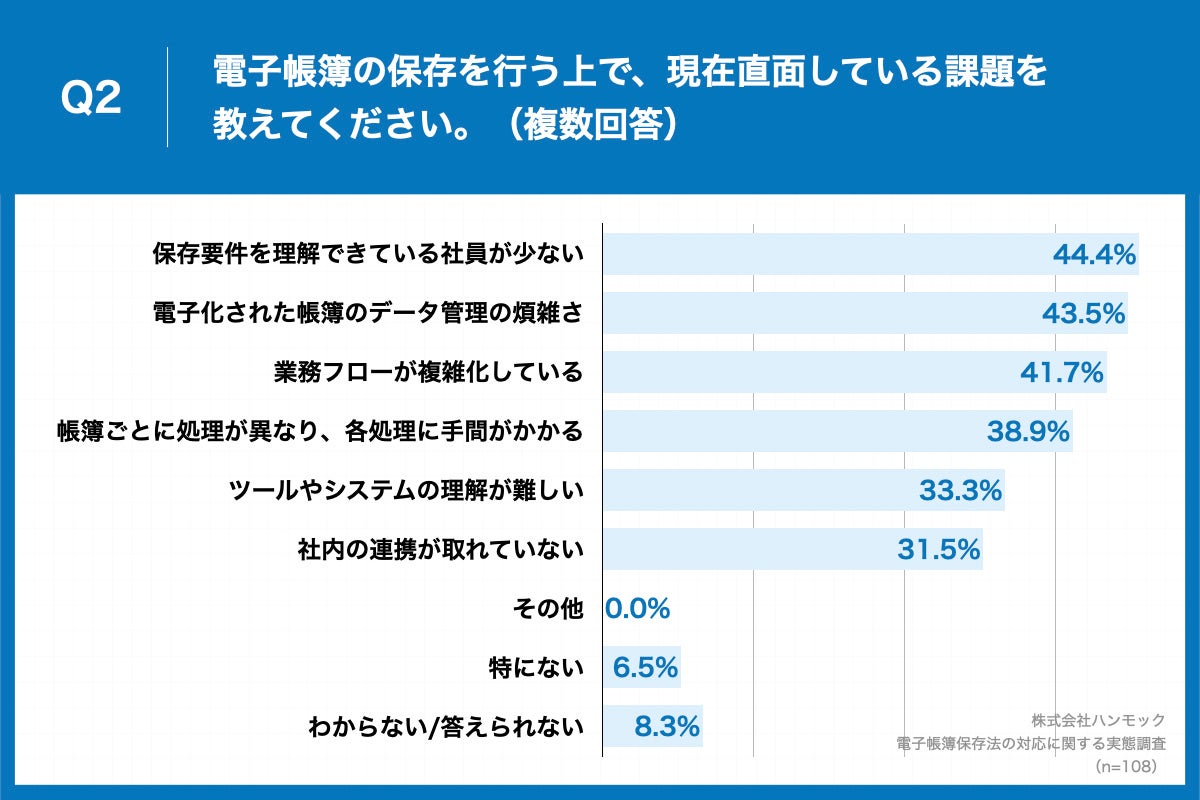 「Q2.電子帳簿を保存する上で、現在直面している課題を教えてください。(複数回答)」(n=108)と質問したところ、「保存要件を理解できている社員が少ない」が44.4%、「電子化された帳簿のデータ管理の煩雑さ」が43.5%、「業務フローが複雑化している」が41.7%という回答となりました。