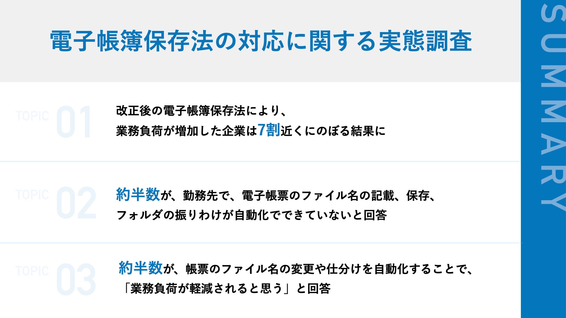 今回の調査では、多くの中小企業が、改正電子帳簿保存法への対応が業務負担の増加につながっていることが明らかになりました。特に、仕様どおりにデータ化されているかどうかの確認作業や、ファイル名の記載やフォルダの振り分けといった基本的な業務も自動化されていないことが、業務の効率化を阻んでいることがわかりました。このような現状を踏まえると、ファイル管理等を自動化することで業務負荷を軽減し、より効率的な業務フローを構築することが求められています。