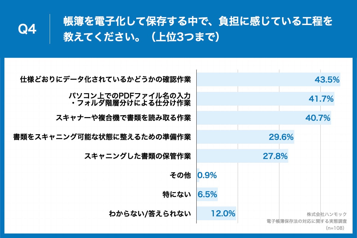 「Q4.帳簿を電子化して保存する中で、負担に感じている工程を教えてください。(上位3つまで)」(n=108)と質問したところ、「仕様どおりにデータ化されているかどうかの確認作業」が43.5%、「パソコン上でのPDFファイル名の入力・フォルダ階層分けによる仕分け作業」が41.7%、「スキャナーや複合機で書類を読み取る作業」が40.7%という回答となりました。