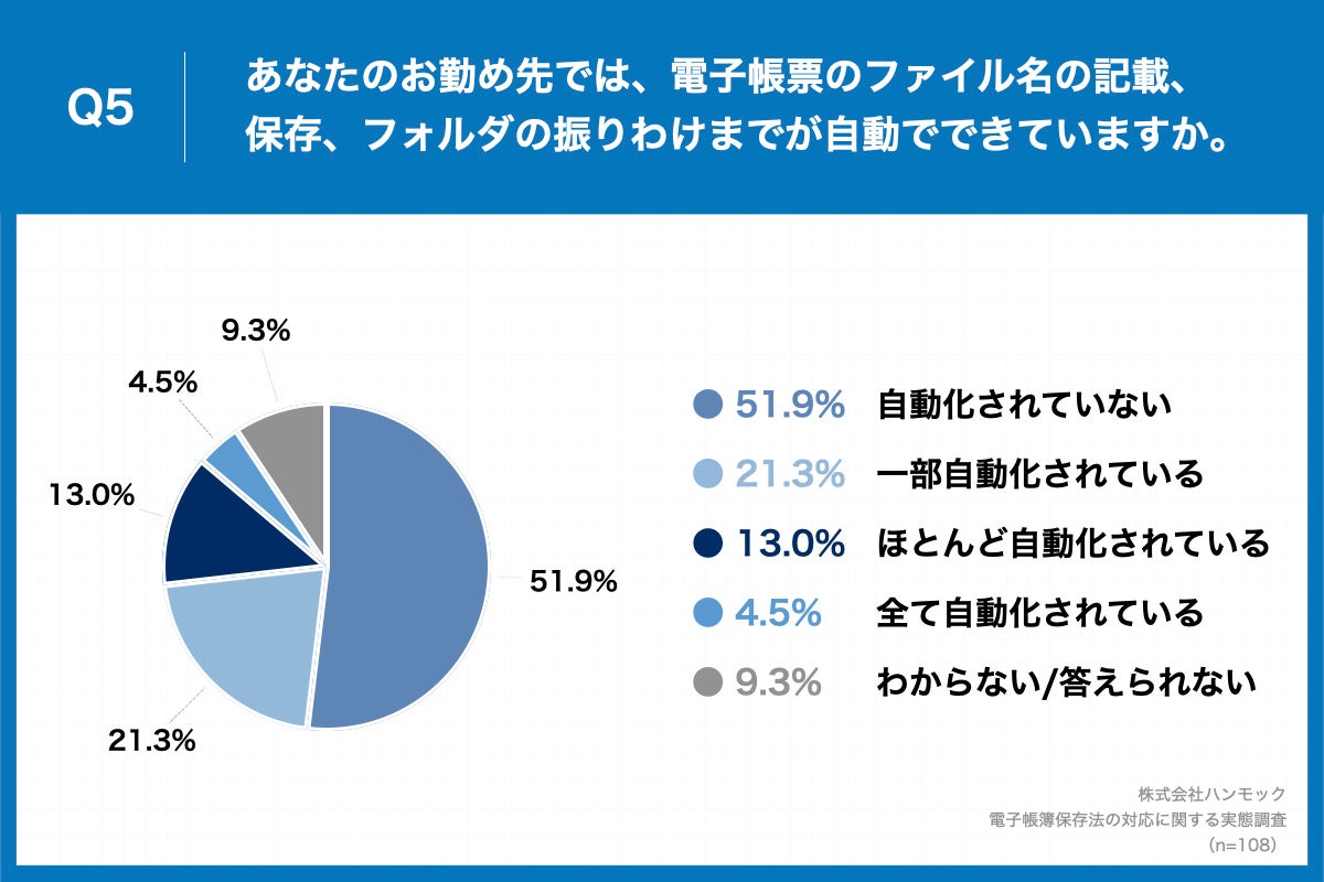 「Q5.あなたのお勤め先では、電子帳票のファイル名の記載、保存、フォルダの振りわけまでが自動でできていますか。」(n=108)と質問したところ、「自動化されていない」が51.9%という回答となりました。