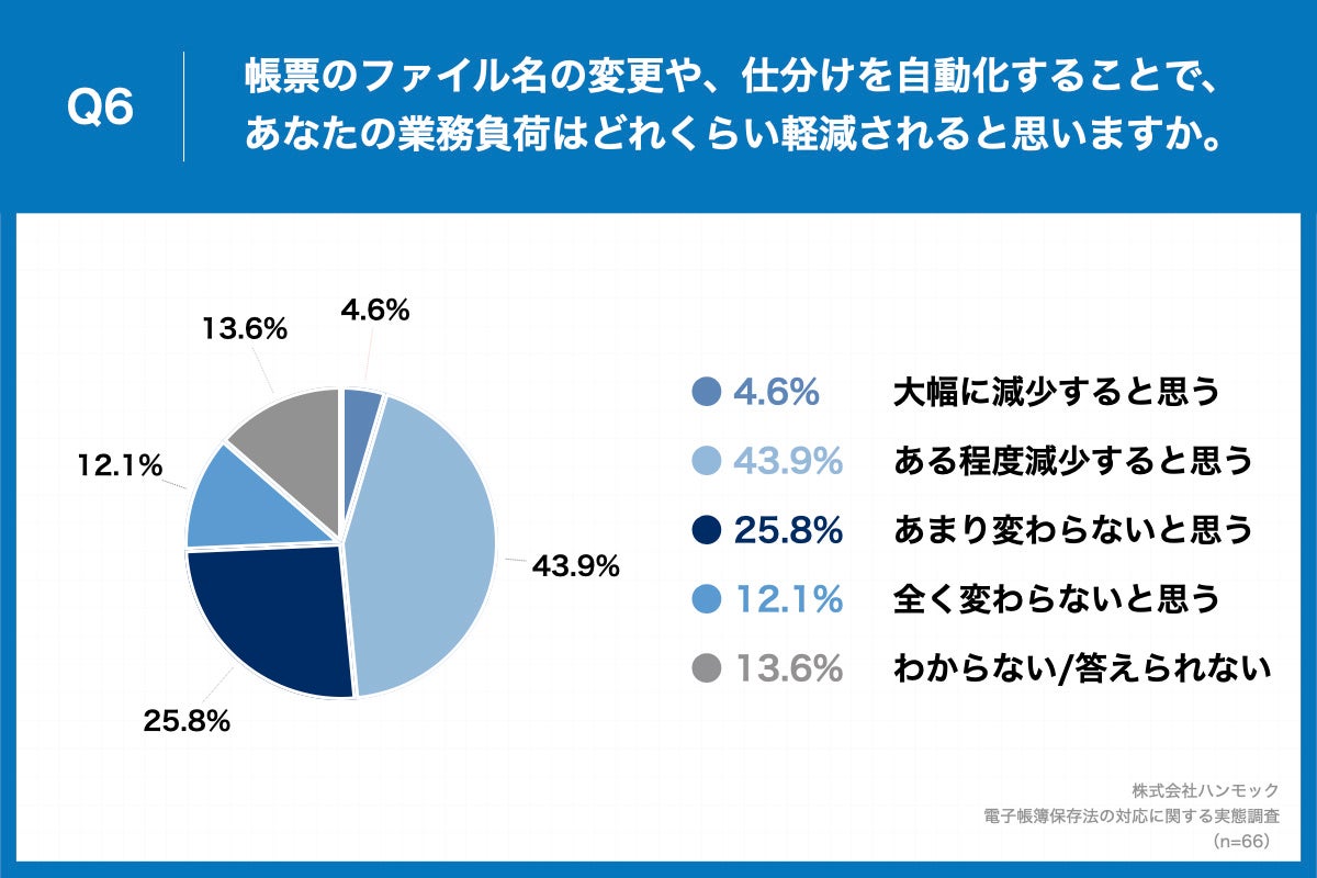 「Q6.Q5で「自動化されていない」「わからない/答えられない」と回答した方に、帳票のファイル名の変更や、仕分けを自動化することで、あなたの業務負荷はどれくらい軽減されると思いますか。」(n=66)と質問したところ、「大幅に減少すると思う」が4.6%、「ある程度減少すると思う」が43.9%という回答となりました。