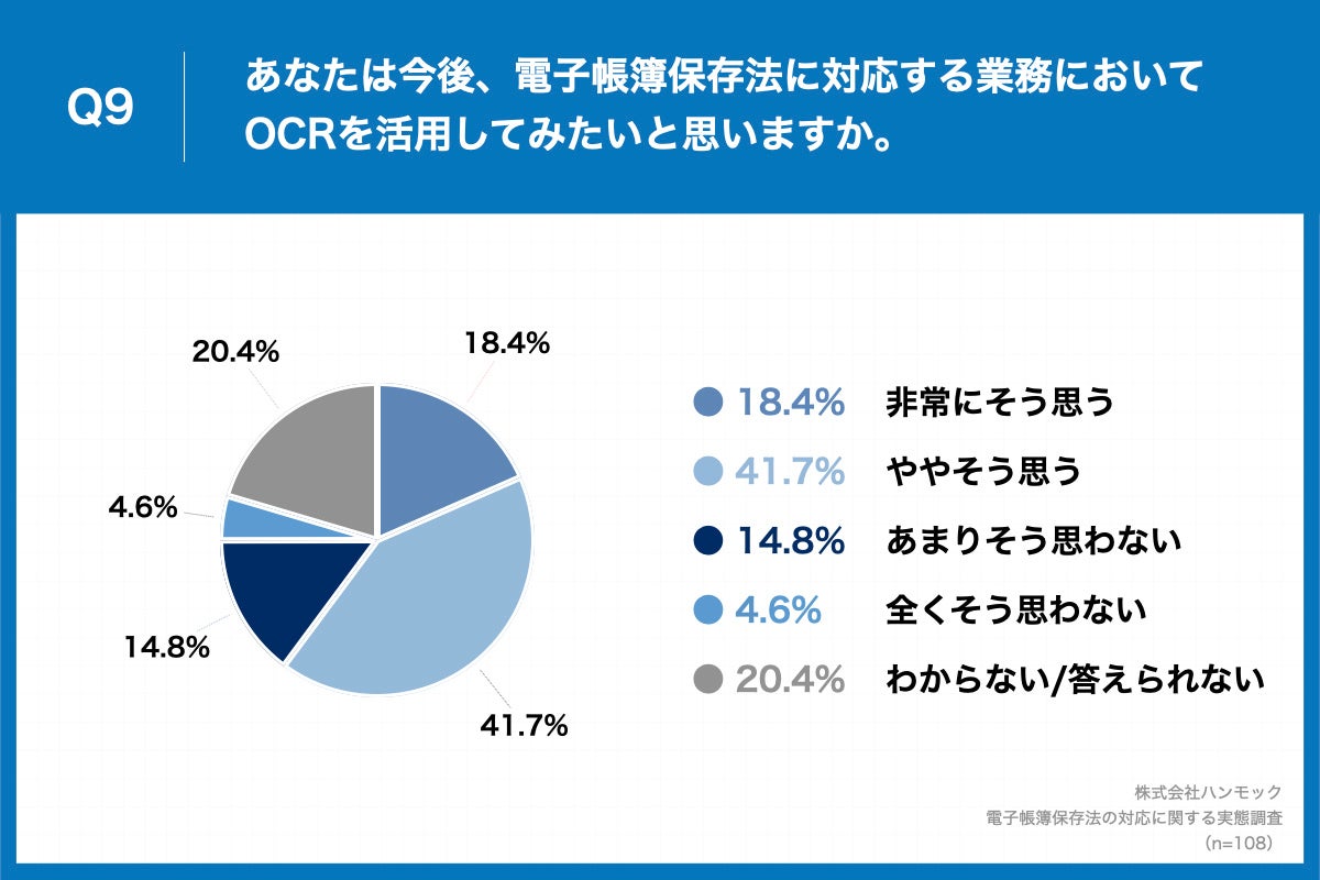 「Q9.あなたは今後、電子帳簿保存法に対応する業務においてOCRを活用してみたいと思いますか。」(n=108)(OCRとは、紙に書かれた文字を読み取ってコンピューターで扱うことができるテキストデータに変換するシステムのことを指します。すでに活用されている方は今後も活用していきたいかでお答えください。)と質問したところ、「非常にそう思う」が18.4%、「ややそう思う」が41.7%という回答となりました。
